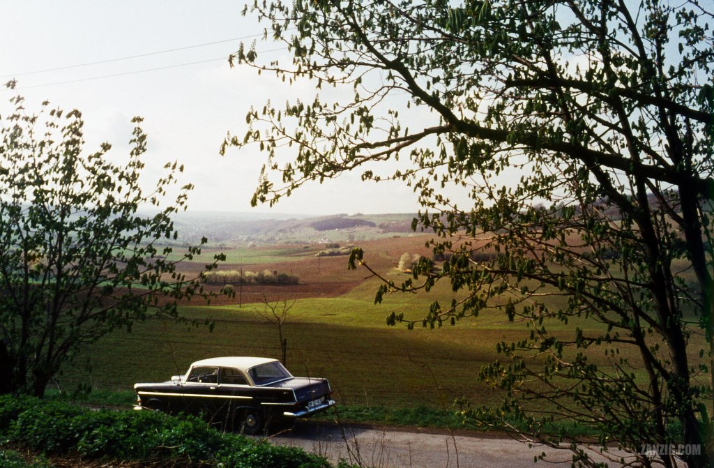 1961 – A new Opel Rekord P2 stands at a road near Saarbrücken in Germany, overlooking the gentle hills of the countryside. Scan © Mark Zanzig/zanzig.com