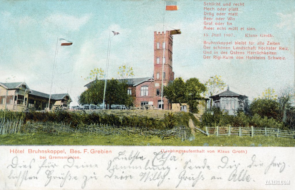 A while ago I shared the story of the restaurant and hotel Bruhnskoppel which was originally owned and operated by my great-great-grandfather, Johann Hinrich Grebien (1826-1903). He had opened a restaurant on top of the Bruhnskoppel, a tiny, attractive hill near Malente-Gremsmühlen. Tourism in the area had been picking up, and the restaurant quickly became a success. Johann added a hotel around 1895, which was run by his son, my great-uncle Friedrich Rudolph Grebien who added the 21 meter tower. Friedrich ran the hotel until the end of 1907 when he sold it.