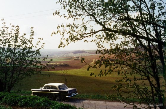 1961 – A new Opel Rekord P2 stands at a road near Saarbrücken in Germany, overlooking the gentle hills of … More