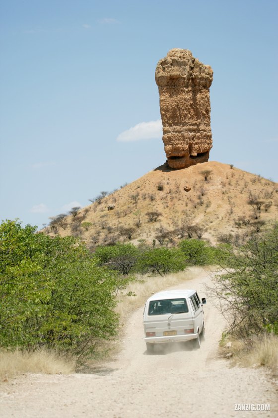 DECEMBER 2006 – A VW Transporter drives up the Vingerklip rock near Outjo in Namibia. © Mark Zanzig/zanzig.com