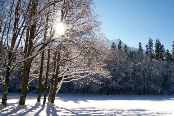 DECEMBER 2001 – A meadow and forest covered with heavy snow on a sunny winter day close to Schloss Linderhof, … More