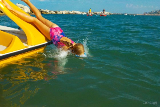 SEPTEMBER 2022 – A girl glides into the Mediterranean Sea from a push pedal boat near Bellaria Igea Marina (RN), … More