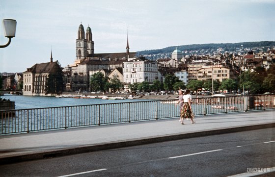 UNDATED – View from the Quaibrücke in Zurich, Switzerland, along the River Limmat with the historic churches Wasserkirche (left) and … More