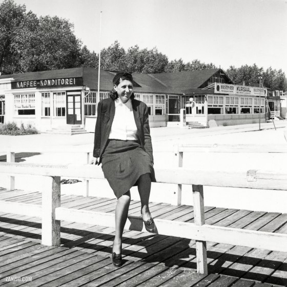 1944 – Edith Schweim poses for the photographer at the pier of Grömitz, Germany. The large café and recreation hall … More
