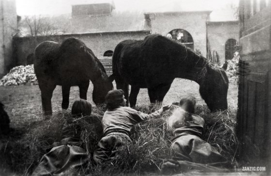 Bredeneek, Preetz, Germany, 1954 APRIL 1956 – Three girls wait for the end of a heavy rain shower in a riding stable at Bredeneek … More