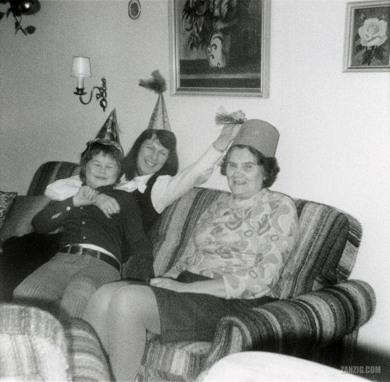 1973 – Mark, Inga and Annemarie Zanzig wear funny party hats for New Years Eve in Flensburg, Germany. © Inga … More