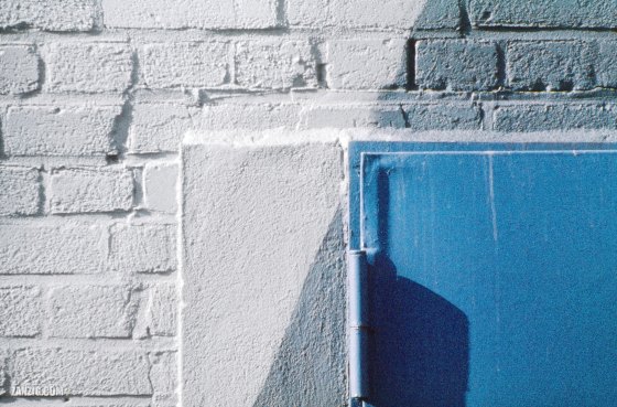1986 – Close-up of a blue door embedded in a wall showing two shades of gray. Photo © Mark Zanzig/zanzig.com