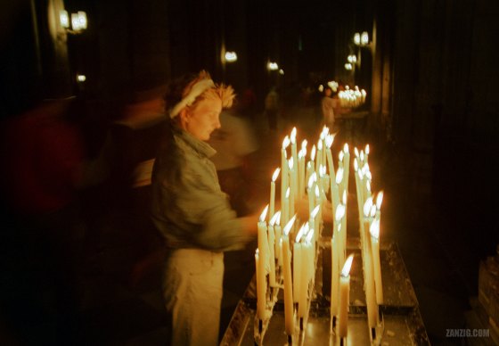 SEPTEMBER 1988 – A woman lights a candle at the basilica Sacré-Cœur in Paris, France. Photo © by Mark Zanzig/zanzig.com