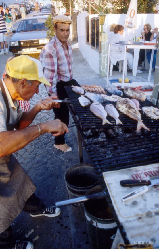 1995 – A cook grills fish in front of a restaurant in Alvor, Portugal. © Mark Zanzig/zanzig.com