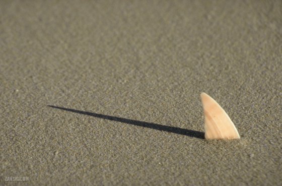 1995 – A light orange shell has been stuck into the wet sand to form a shark fin with a … More