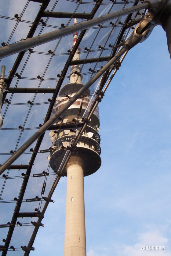 JUNE 2002 – The TV Tower of Munich, Germany, seen through the transparent roof of the Olympic Stadium. © Mark … More