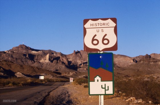 SEPTEMBER 2003 – Historic Highway 66 sign near Kingman, Arizona, USA. Photo © Mark Zanzig/zanzig.com