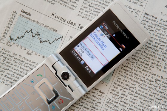 JULY 2006 – A BenQ Siemens EF81 mobile phone shows a Google search page in front of a newspaper showing … More