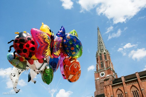 MAY 2006 – Colorful balloons float next to the tower of the Mariahilf Church in Munich, Germany, on a sunny … More