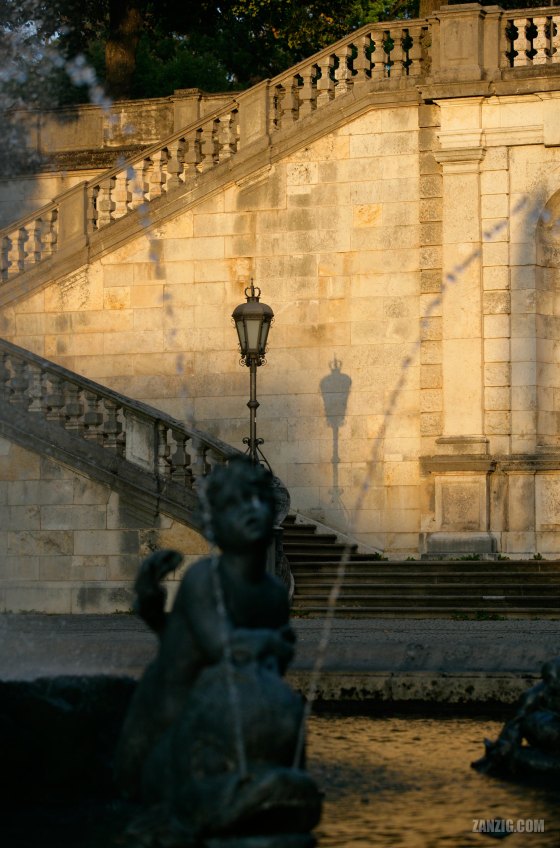 SEPTEMBER 2006 – The fountain below the Friedensengel (Angel of Peace) in Munich, Germany, sprays its water at sunset time. … More