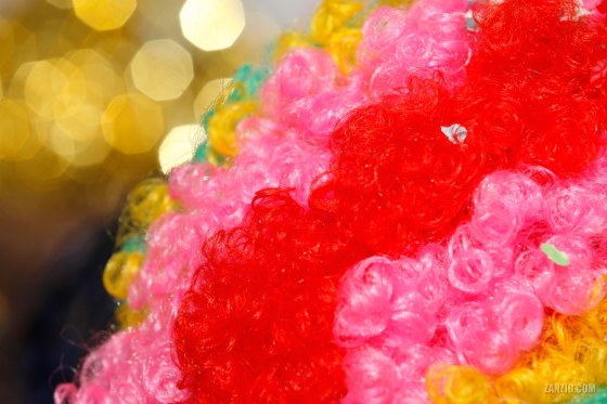 FEBRUARY 2007 – A clown wig in bright red, pink, and yellow, colors against a blurred background during the Mardi … More