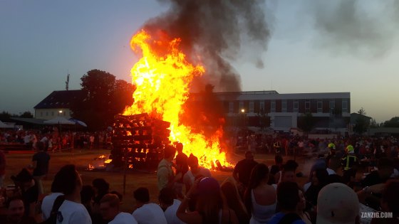 JUNE 2022 – A giant fire made from stacked wood burns brightly with yellow and red flames during a midsummer … More