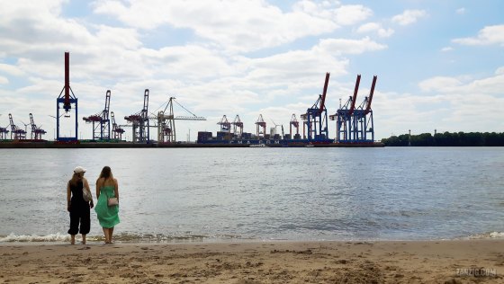 AUGUST 2023 – At the beach of Oevelgönne, two women gaze at the huge cranes of the harbour in Hamburg, … More