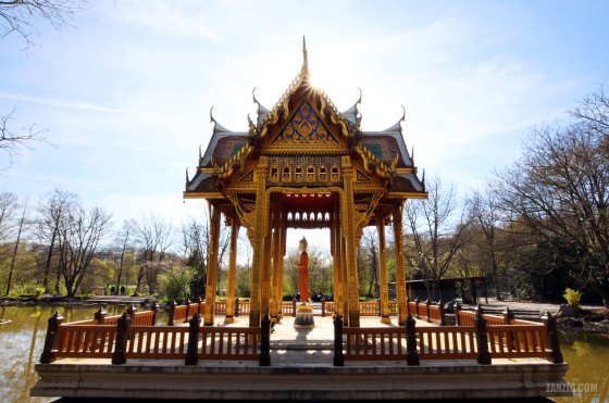 APRIL 2023 – Side view of the Sala Temple in the Westpark in Munich, Germany, on a sunny spring day. … More