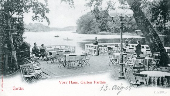 A postcard shows the outdoor area of a restaurant at the lake promenade near the Voss House in Eutin, Germany. … More