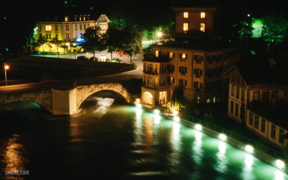 2004 – Nightly view from the Nydeggbrücke in Bern, Switzerland, across the River Aare and the Untertorbrücke. © Mark Zanzig/zanzig.com