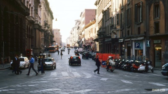 1999 – View into Via Rizzoli from the base of Torre degli Asinelli in Bologna, Italy. Photo © by Mark … More