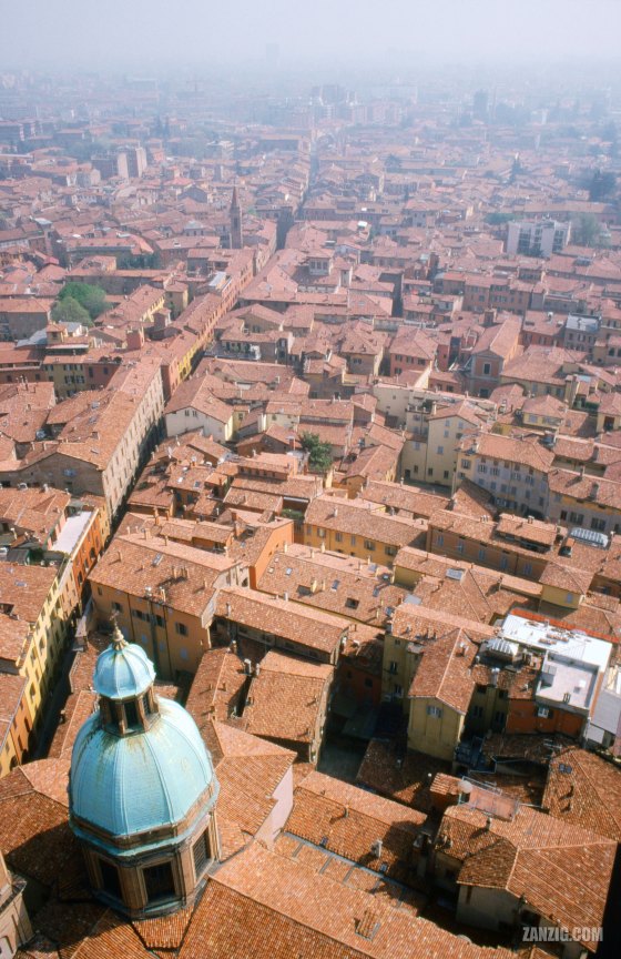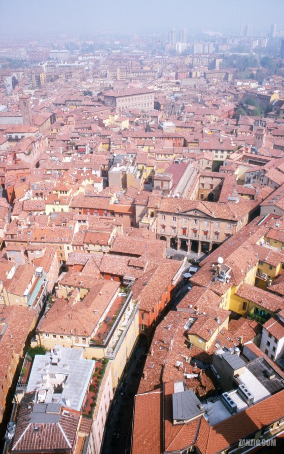 1999 – The city of Bologna, Italy, with the Via Zamboni in the center, seen from the Torre degli Asinelli. … More