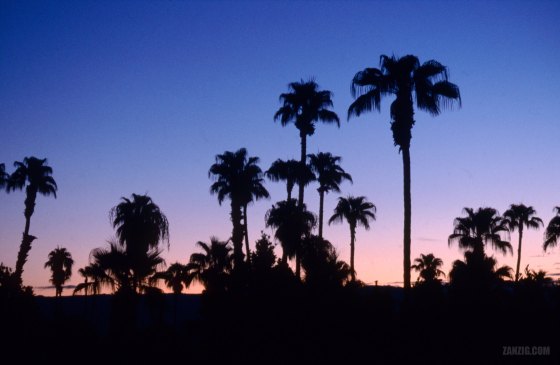 SEPTEMBER 2003 – The silhouettes of several palm trees against a deep blue and purple sky in Palm Springs, California. … More