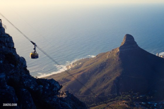 MARCH 2004 – The Aerial Cableway descends from Cape Town’s Table Mountain towards the lower station with the Lion’s Head … More