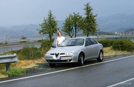 AUGUST 2000 – Petra Zanzig stands next to an Alfa Romeo 156 2.0 TSpark parked on the curb of the … More