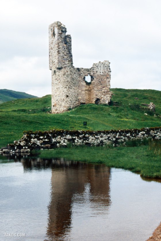 JULY 2005 – Ardvreck Castle reflects on the surface of Loch Assynt in Scotland on a cloudy day. © Mark … More