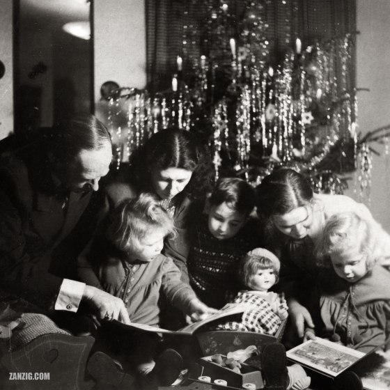 DECEMBER 1944 – A family explores Christmas gifts in their home in Malente-Gremsmühlen, Germany. Scan © Mark Zanzig/zanzig.com
