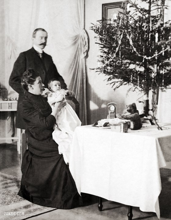 DECEMBER 1910 – A family celebrates Christmas in Germany. The small Christmas Tree stands on a table, and a teddy … More
