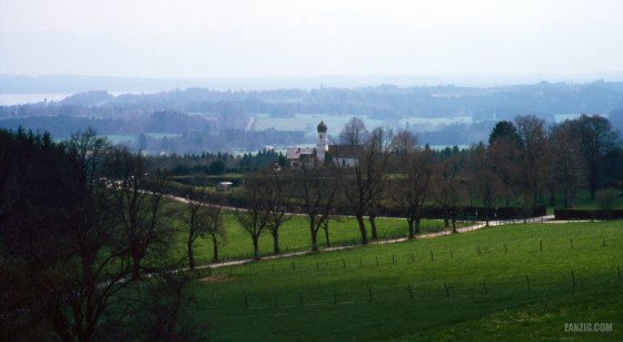 2003 – The church St. Nikolaus in Oberzeismering near Tutzing, Bavaria, seen from the Ilkahöhe on a sunny day in … More