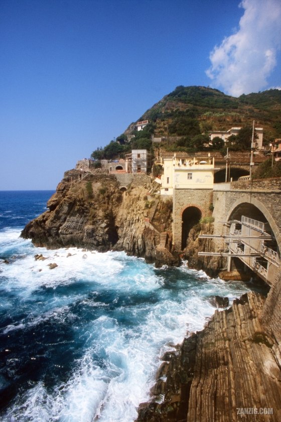 AUGUST 2000 – View along the rugged coastline near Riomaggiore in Italy, with the Riomaggiore train station on the right. … More