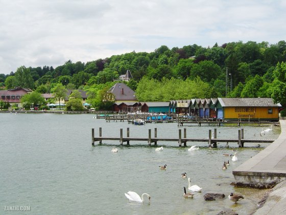JUNE 2005 – View along the colorful traditional boat houses in Starnberg, Bavaria, Germany. © Mark Zanzig/zanzig.com
