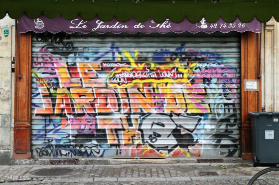 MAY 2024 – Colorful grafitti decorates the roller shutters of the restaurant Le Jardin de Thé in central Paris, France. … More