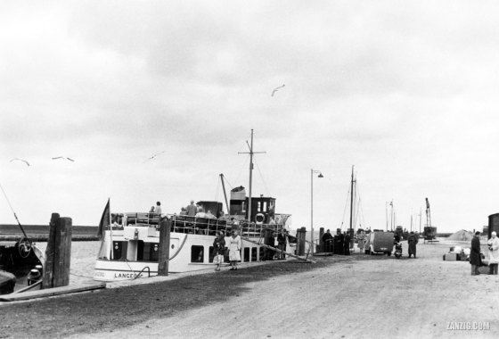 1957 – The ferry Langeoog IV waits for passengers at the harbour of Bensersiel in Germany. © Mark Zanzig/zanzig.com