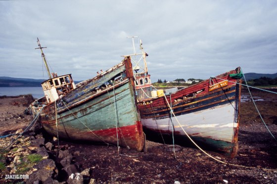 JULY 2005 – Two ship wrecks rest on the coast of the Isle of Mull near Salen, Scotland. Photo © … More