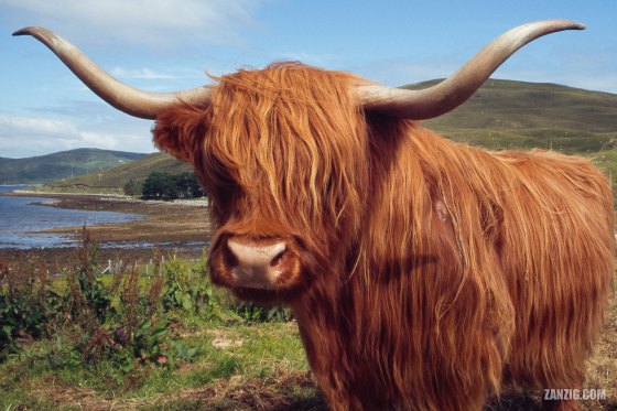 JULY 2005 – Highland cattle at Loch Sligachan on the Isle of Skye in Scotland. © Mark Zanzig/zanzig.com