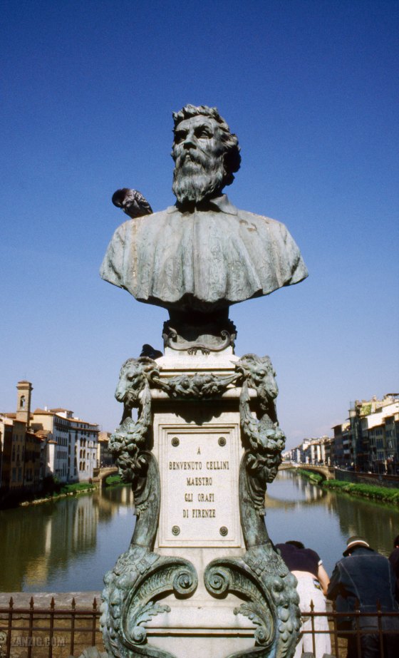 1999 – The Monumento a Benvenuto Cellini on the Ponte Vecchio in Florence, Italy, on a sunny morning. © Mark … More