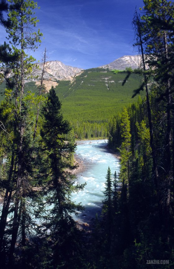 AUGUST 2002 – Sunwapta River in the Jasper National Park in Alberta on a clear summer day. © Mark Zanzig/zanzig.com