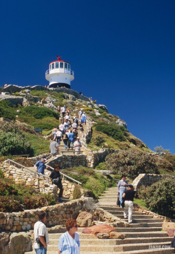 MARCH 2004 – Tourists walk up the stairs to the lighthouse at the Cape of Good Hope near Cape Town, … More