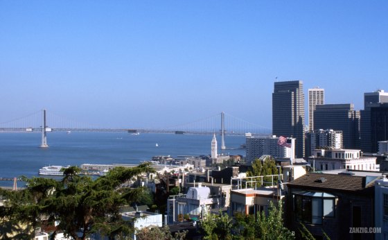 SEPTEMBER 2003 – Downtown San Francisco and the Bay Bridge, photographed from the Coit Tower in San Francisco, California, on … More