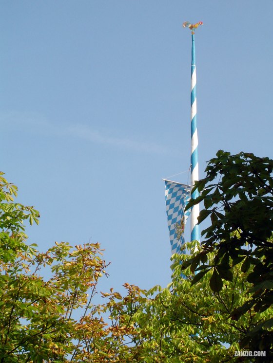 SEPTEMBER 2004 – A traditional May Tree with blue and white stripes shines through the trees of the Leiberheim beer … More