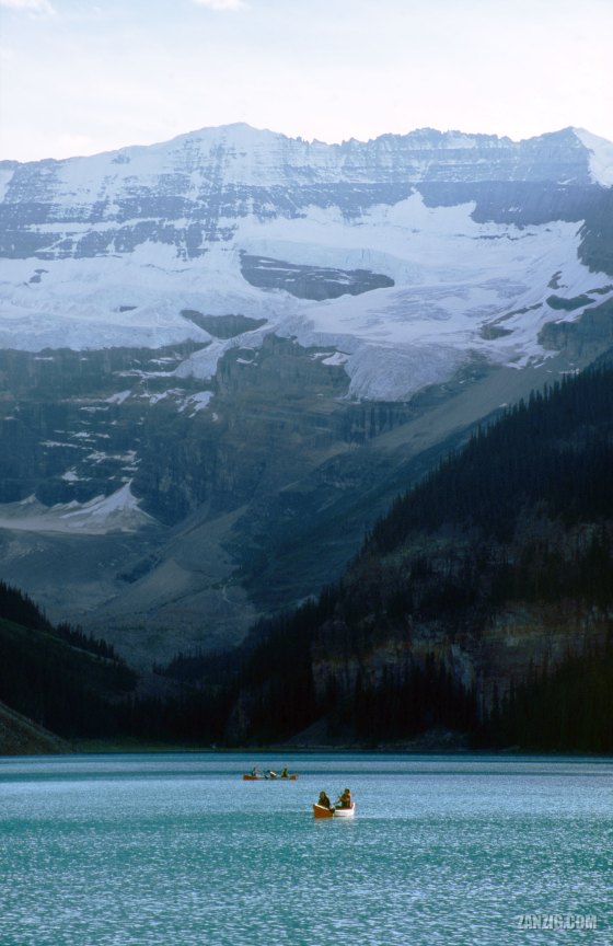 AUGUST 2002 – Tourists in canoes explore Lake Louise in Alberta, Canada, on a sunny afternoon. © Mark Zanzig/zanzig.com