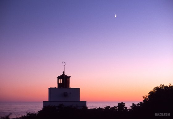 AUGUST 2002 – Amphitrite Lighthouse on Vancouver Island, British Columbia, Canada right after sunset. Photo © Mark Zanzig/zanzig.com