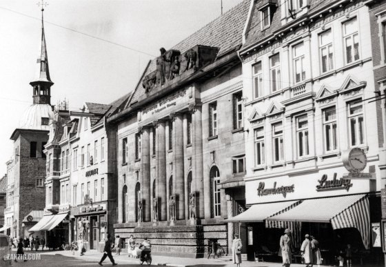 MAY 1955 – View along the Lange Straße in in Oldenburg (Lower Saxonia), Germany, with the iconic clock tower Lappan … More