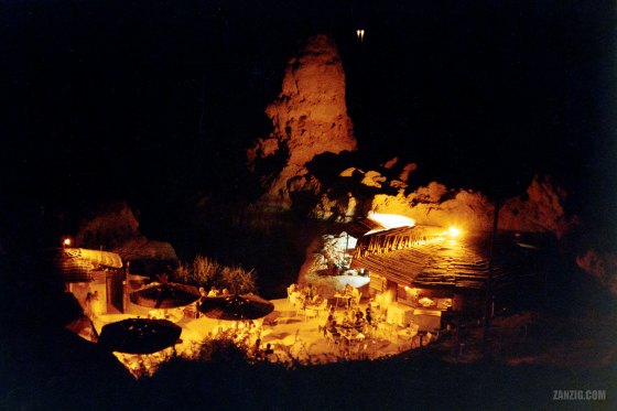 AUGUST 1987 – Nightly view of a bar located between the massive rocks of Algar Seco in Carvoeiro in Portugal. … More