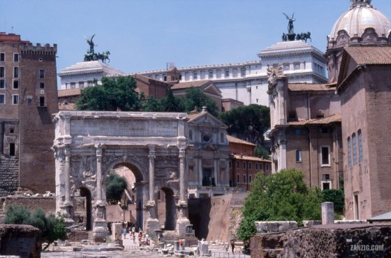 JUNE 2005 – View across the Via Sacra with the Arco di Settimio Severo in Rome, Italy. In the back, … More